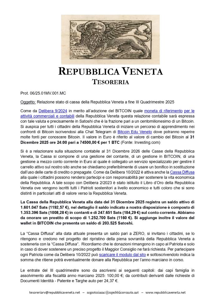 Caro Cittadino della Repubblica Veneta, nell'assolvere il proprio mandato e come da regolamento, la Tesoreria con proprio documento pubblica la relazione di Cassa della Repubblica Veneta certificata per il III Quadrimestre 2025 con le sue conclusioni e approvata nella riunione del Maggior Consiglio del 12.03.2026.